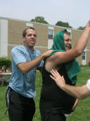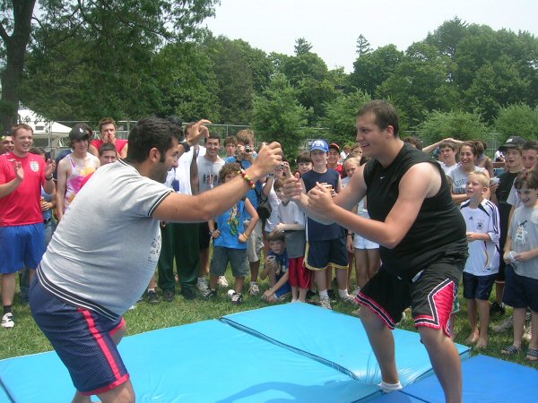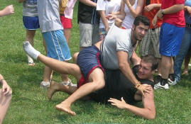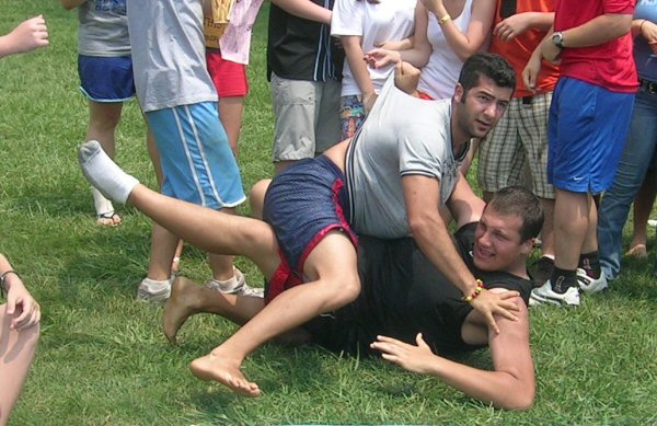 pillows stuffed under shirts, the first to be pinned down on the cushioned