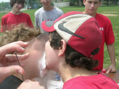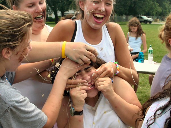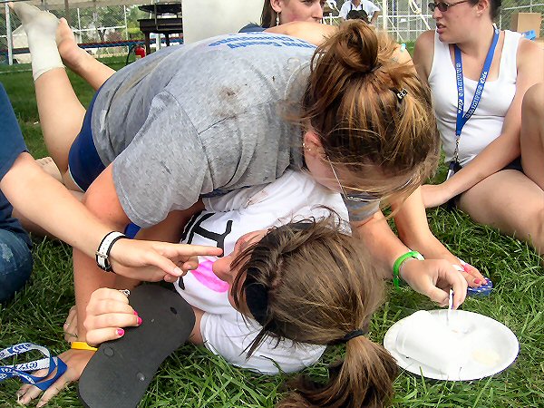 eat a doughnut off of a string before their opponents, lying shoulder to