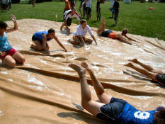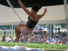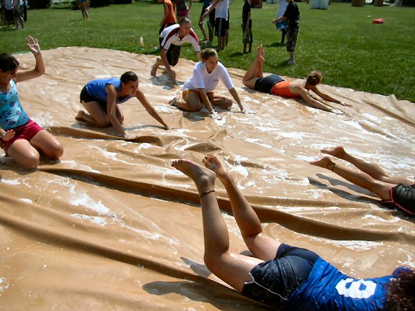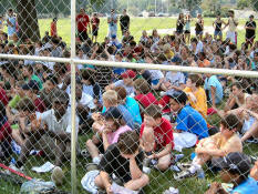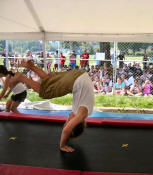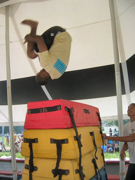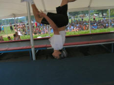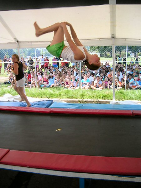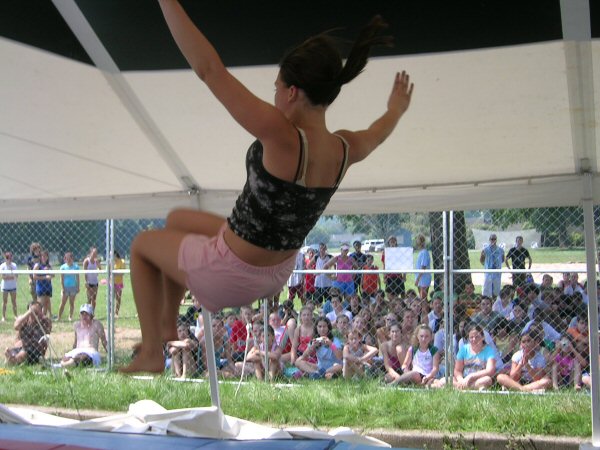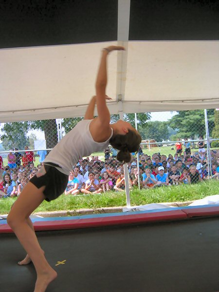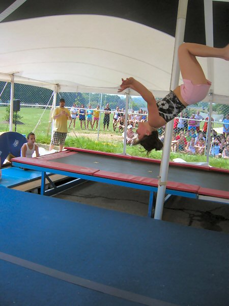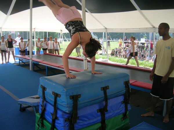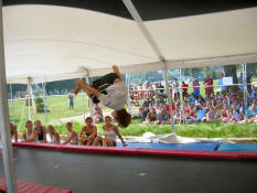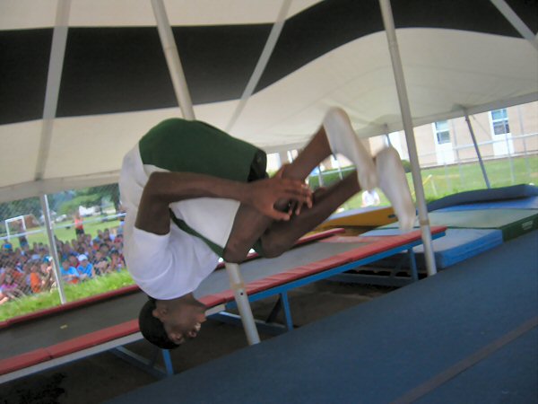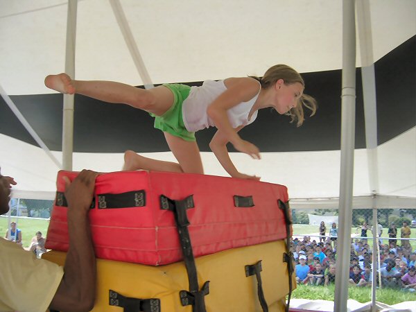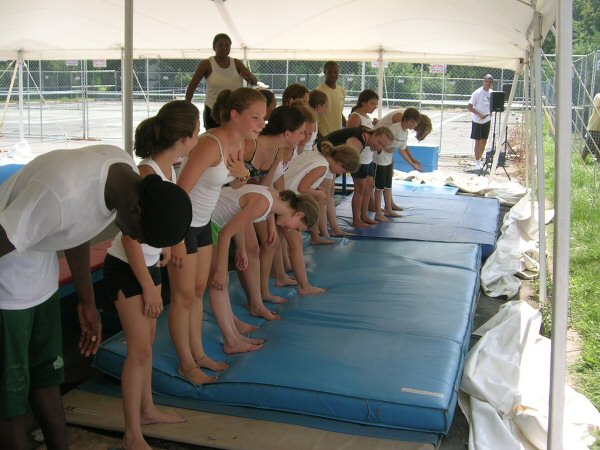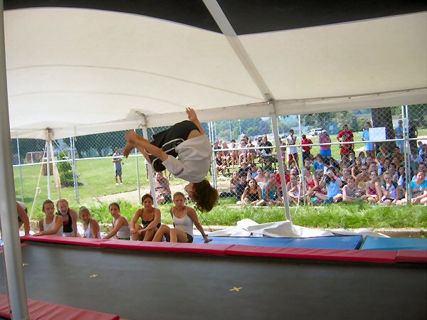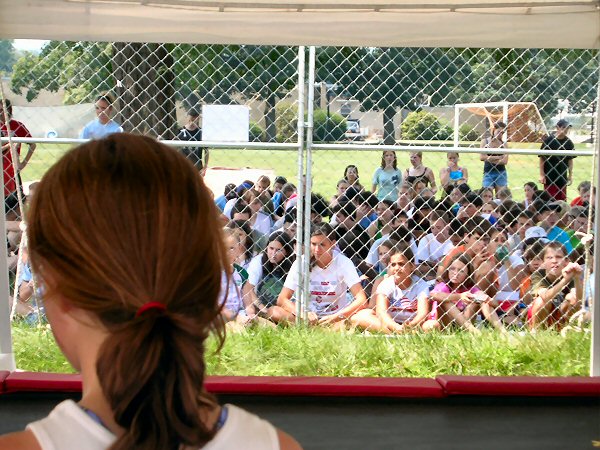 entire camp gathered around the tent to watch the annual gymnastics show. |