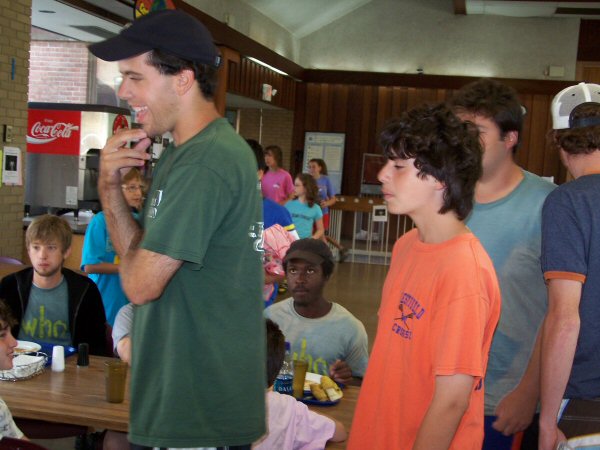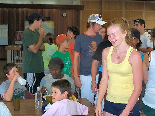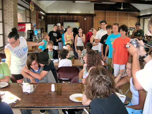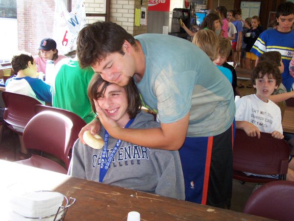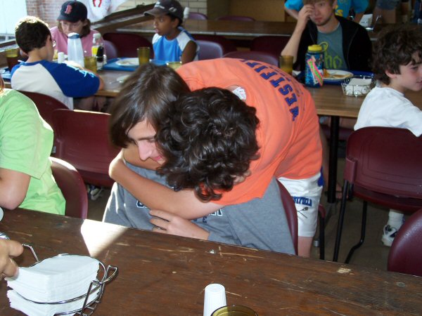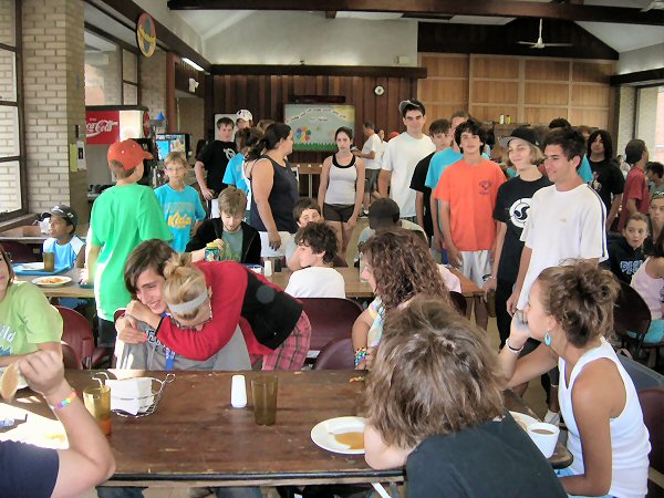 At breakfast, campers and counselors saw these signs, and, like lemmings, followed the instructions. Getting through the cafeterias was not easy with a sea of campers and counselors giving bear hugs at every inch. |
