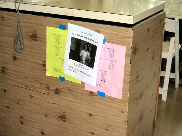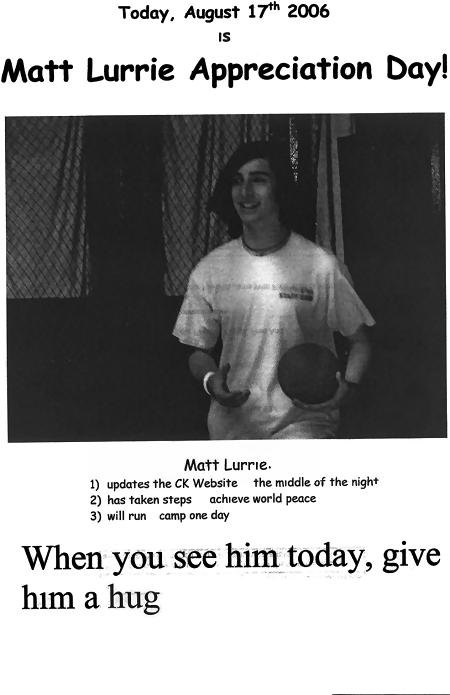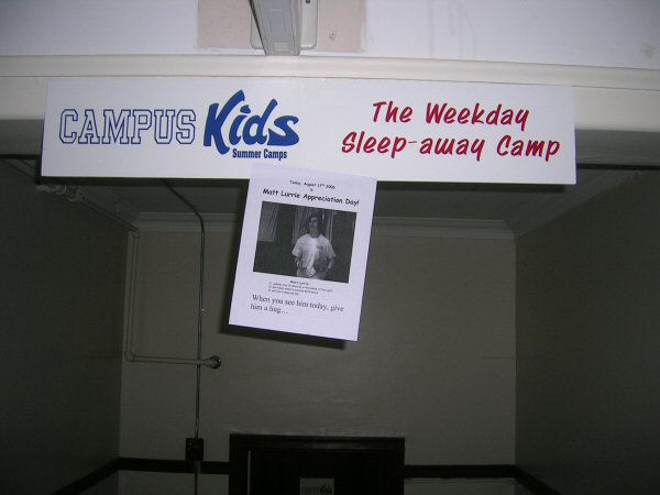 I was beside myself. There were no words to express the overwhelming sense of family I felt today. As the song was being sung, I was on the verge of pulling a Teri. I want to thank everyone at Campus Kids for their love today and throughout the summer. This truly touched me. ~Matt Lurrie~ |
