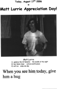 Lur Lur Lurrie Lur Lur Lurrie Risin' up, with the young kids Got a camera, got the long hair Don't forget about the pictures he took We must fight, to make sure, he's recognized. It's the day of the Lurrie He's the guy that we like Updating websites and making us smile (bright-ly) And if someone ever asks us who's that dude running by We will always have to reply...Hey, that's Matt Lurrie Lur Lur Lurrie Lur Lur Lurrie Lur Lur Lurrie Lurrie takes the pics! |
