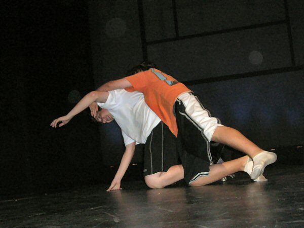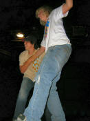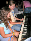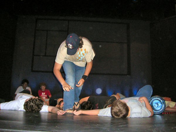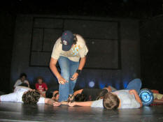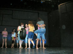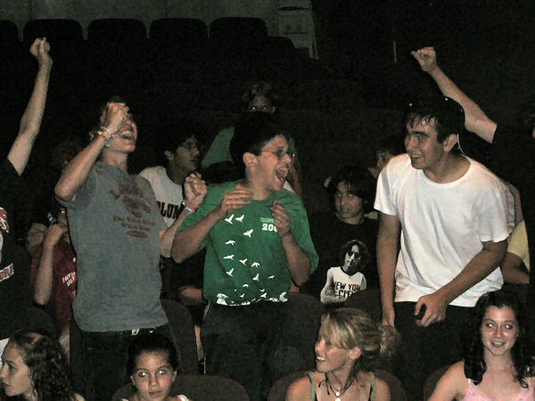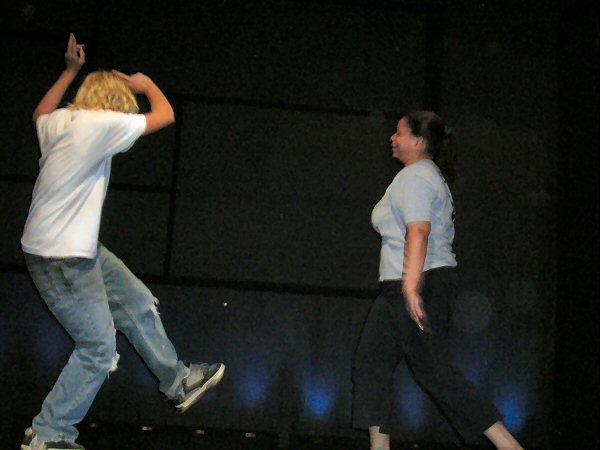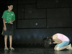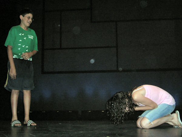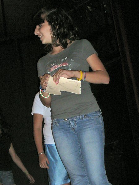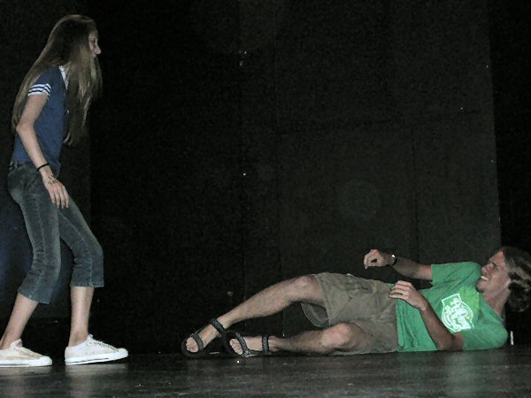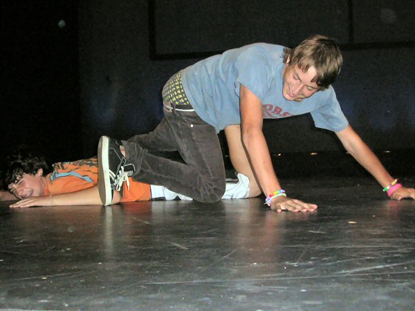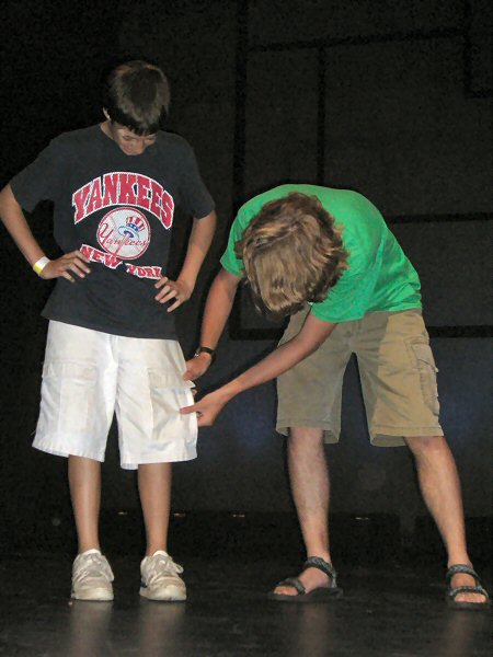 Once the groups had gone, the judges began to tally the scores. But in the meantime, eager campers played a spirited game of Freeze. If you are not familiar with this game, here is how it is played: two people begin acting out a skit, usually with exaggerated expressions. Then, when an audience member wants, they yell freeze, and the actors freeze in their absurd positions. Then, the person who yelled 'freeze' replaces one of the actors and begins an new skit. |