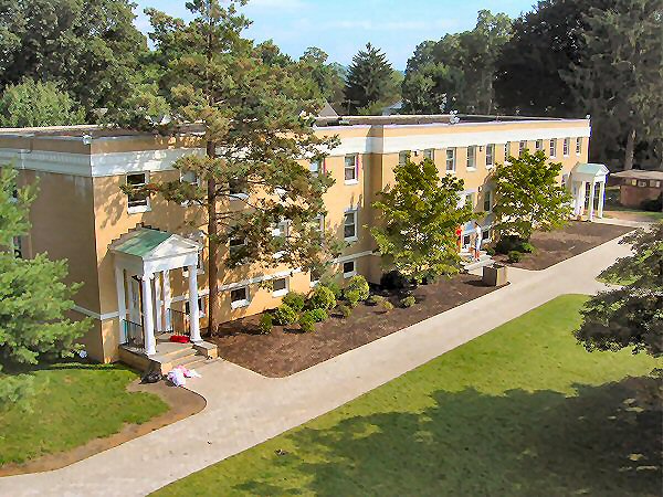 squat brick building perpendicular to Van Winkle Hall in the quad, receives