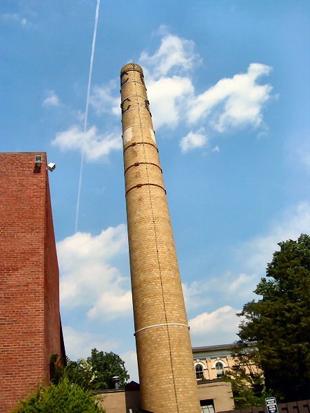 from Centenary's boiler room stands tall across the backdrop of a light blue sky. |