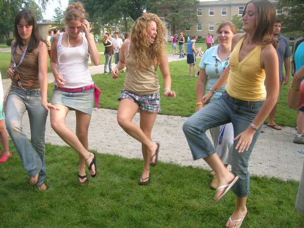 they fear ruining their shoes on the grass dance floor, after a torrential