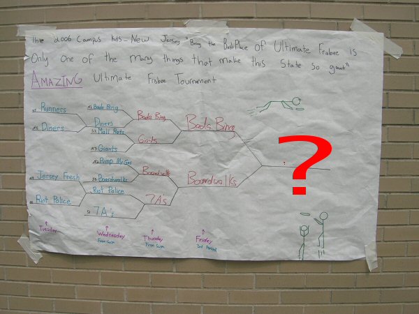 It is usually the highlight of the summer. Some campers even plan their summer around it. I speak, of course, about the ultimate Frisbee tournament. This year, the "2006 Campus Kids 'Being the birthplace of Ultimate Frisbee is only one of the many things that make this state so great' Amazing Ultimate Frisbee tournament" had over 140 participants, both camper and staff. After two weeks of fierce battles, the tournament came down to two teams: the Lodi Bada Bings and the Atlantic City Boardwalks. |