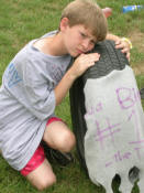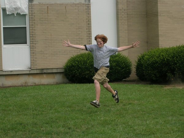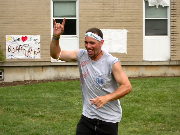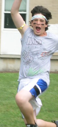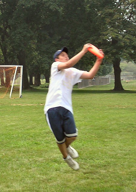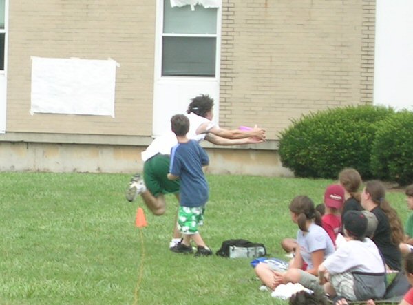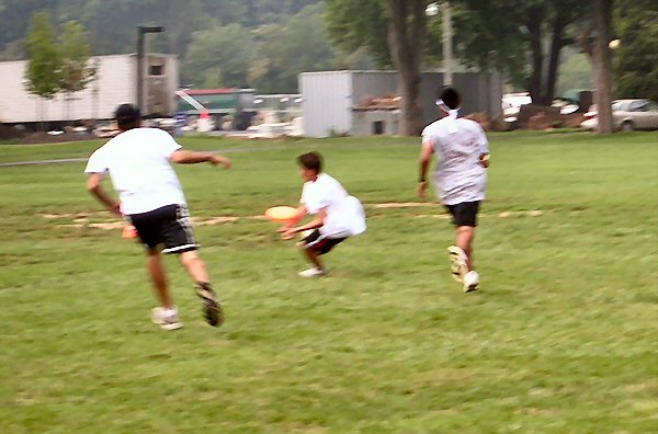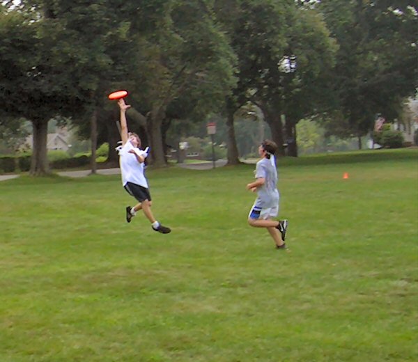 Now, I must say that while watching this exciting game, I had picked out a team to win, on account of what I had seen earlier in the game. Thinking this, I ran down the field to the end zone that Bada Bing was trying to score from. Therefore, I have no picture of the brilliantly aimed throw to Zack S. in the opposite goal that he leaped for. I do, however, have the aftermath shot: |
